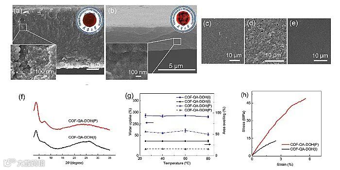 图3. (a) COF-QA-DOH(I)膜和(b) COF-QA-DOH(P)膜的断面SEM图;COF-QA-DOH(I)膜面向有机相-水相反应体系的(c) 有机相侧、(d) 水相侧SEM图和(e) COF-QA-DOH(P)膜表面SEM图;COF-QA-DOH(I)膜和COF-QA-DOH(P)膜的(f) XRD图、(g) 吸水率和面积溶胀和(h) 应力应变曲线图。