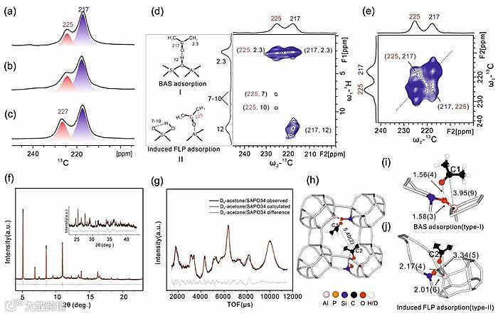 图1. 丙酮吸附在SAPO分子筛上的固体核磁实验结果(a-e);同步辐射X射线衍射/中子衍射实验得到的两种丙酮吸附构型(f-j)。