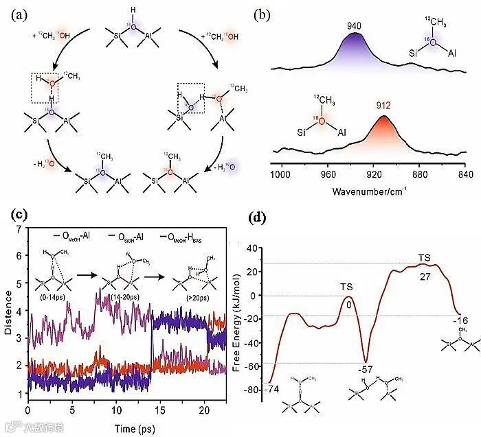 在此基础上,进一步研究了SAPO分子筛活性中心上甲醇的吸附构型和脱水反应机理(图2)。相比于普通硅铝分子筛,实验结果表明SAPO分子筛能够在室温下催化甲醇脱水形成表面甲氧基物种。通过18O标记甲醇的原位漫反射红外实验,证实在整个反应过程中甲醇分子内的C-O键并没有发生断裂,脱去的水分子的氧来源于分子筛骨架而不是甲醇分子(图3),从而验证了极性分子吸附诱导SAPO分子筛形成FLP结构的普适性。通过从头算分子动力学方法,实时动态模拟了室温下甲醇在SAPO-34分子筛上从Brønsted酸吸附态到诱导FLP吸附构型的转变过程,发现基于诱导FLP结构的反应路径生成表面烷氧的能垒远低于直接通过Brønsted酸脱水生成表面烷氧的能垒,因而具有较高的反应活性。