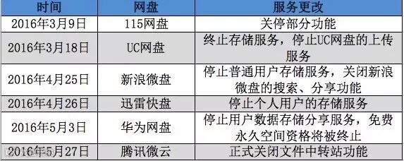 4月26日,迅雷旗下的快盘也宣布将停止个人用户的存储服务,所有用户数据保留至2016年6月30日,全面转型个人视频服务。