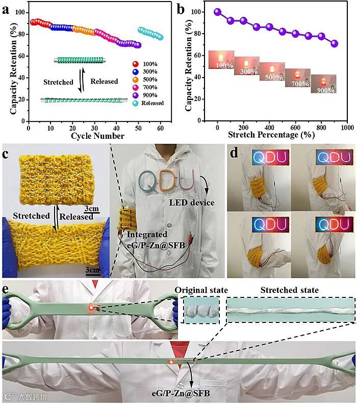 超拉伸纤维基锌离子电池在极端机械变形下表现出优越的电化学稳定性,拉伸到900%后仍能保持原有容量的71%。当释放到自然状态时,该电池也显示84%的保留率。将eG/P-Zn@SFB串联充电,然后连接红色LED指示灯,当电池拉伸到900%后仍然对LED指示灯进行高效供电,表明eG/P-Zn@SFB具有优秀的抗拉伸性能。