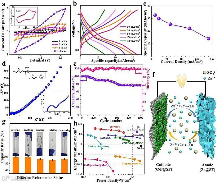 通过循环伏安法(CV)、恒流充放电法(GCD)和电化学阻抗谱(EIS)分析,表征了G/P-Zn@SFB的电化学性能(图2)。该预制电池具有高比容量(32.56 mAh/cm3)和能量密度(36.04 mWh/cm3),并具有优异的循环稳定性(循环1000次后仍保持76.5%的容量),库伦效率达到100%左右。