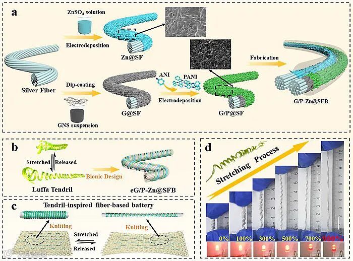 为了解决以上问题,青岛大学智能可穿戴技术研究中心田明伟教授、曲丽君教授团队设计了一种具有螺旋结构的超拉伸纤维基锌离子电池(图1)。受藤蔓的生物结构启发,纤维电池以螺旋结构紧密缠绕在弹性丝表面,并可通过简单的针织工艺集成到织物中,验证了其在可穿戴能源纺织品应用方面的潜力。电池的拉伸程度达到900%时依然可为LED等进行有效供电。可见,具有螺旋结构的超拉伸纤维基锌离子电池对于可拉伸储能设备和可穿戴电子产品的应用是十分有必要的。
