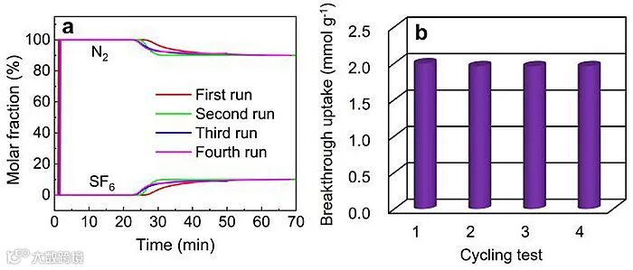 鉴于Cu-MOF-NH2热力学上令人兴奋的分离特性,使用SF6/N2二元气体混合物(SF6:N2 = 10:90)在298 K下进一步进行了混组分穿透实验(图3a)。值得注意的是,N2在约1.2分钟后立即从固定床柱中洗脱,其在出口的纯度可达到99.99%以上。相比之下,SF6穿透出现在28分钟后,并在64分钟内达到吸附饱和状态。图 3b 进一步表明Cu-MOF-NH2的SF6吸附容量在四个循环的穿透实验后几乎保持不变。