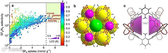 图1a提供了在工业相关工作条件(SF6:N2 = 10:90 气体混合物;1.0 bar 和 298 K)下CoRE-MOF 数据库中选取材料(PLD > 5.5 Å)的模拟SF6/N2选择性和SF6吸附量的四维可视化图。其中,绿色阴影区域可以识别为能克服trade-off现象的最佳候选MOFs。其中突出显示的四个候选物具有相同的ssa型拓扑(图1b)。值得注意的是,这四种MOFs均由Cu或Zn轮浆单元组成,且其中一个空腔(图1c)在一定程度上具有类似于杯[3]芳烃分子的形状。