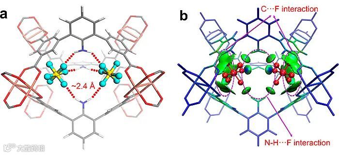 类杯芳烃空腔A中SF6的DFT优化几何结构显示,SF6分子的三个F原子同时分别与-NH2基团的H原子相互作用(图5a),形成了平均距离约为2.4 Å的氢键型相互作用。独立梯度模型(IGM)分析(图5b)不仅证实了这些氢键相互作用的存在(等值面中的蓝色区域),并且还揭示了SF6分子与周围孔壁之间形成了范德华型相互作用(等值面中的绿色区域)。