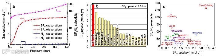 图2. Cu-MOF-NH2中的单组分吸附等温线及其对SF6/N2分离性能