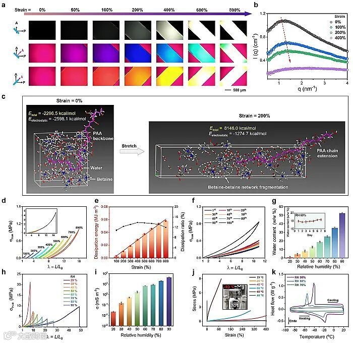 图2. PAA-甜菜碱离子皮肤的应变硬化机理与力学/电学性能。