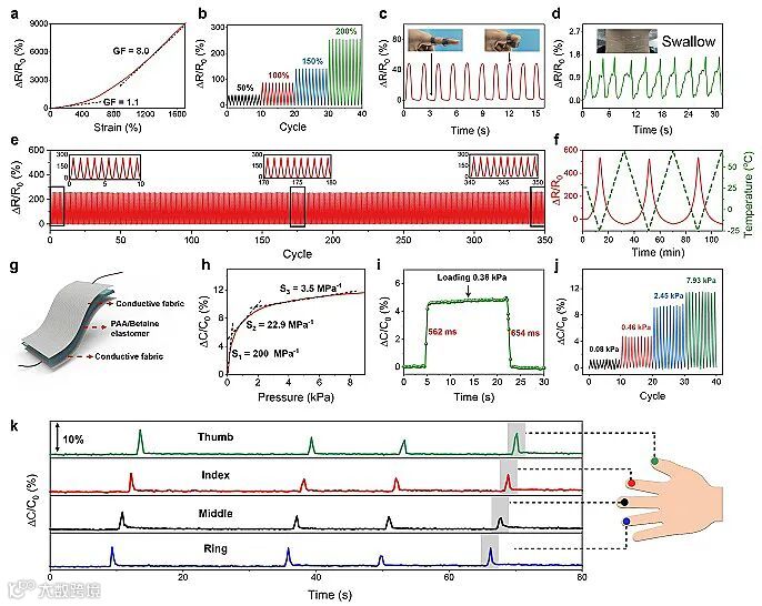 良好的生物相容性和离子导电能力使得PAA-甜菜碱离子皮肤非常适于监控人体运动和温度变化等信息。其电阻变化在小应变和大应变下分别具有1.1和8.0的灵敏度系数,循环拉伸测试表现出稳定的信号输出。此外,将该离子皮肤与弹性导电布结合,还可组成弹性离电电容传感器件,实现按压信号的多通道实时感知。