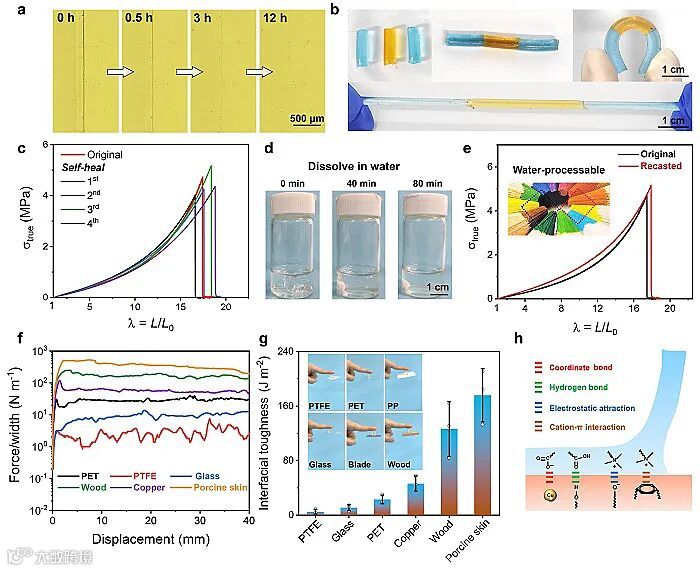 将该离子皮肤材料置于80%相对湿度下12小时,能完全消除材料表面的划痕,并使得力学性能基本恢复。此外,这一材料含有大量两性离子小分子,在80 min内溶于水,溶解后的水溶液涂膜可完全再生。由于材料表面含有丰富的羧酸和带电基团,这一离子皮肤对多种基材也表现出较强的粘附能力。