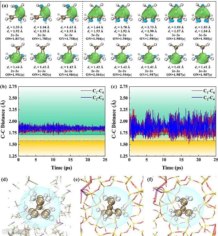利用适应性自然密度划分方法,计算降冰片基碳正离子的电子结构特性,并通过三中心-两电子(3c-2e)轨道的存在与否作为区分经典和非经典碳正离子的标准;之后,通过真实条件下的原位动力学模拟追踪了室温下降冰片基碳正离子在ZSM-5分子筛限域孔道中的动态变化,统计结果发现,在分子筛限域环境中降冰片基碳正离子主要以非经典形式存在。