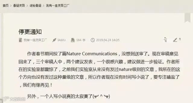 这是在豆瓣上看到的一个帖子,帖子内容是起点《我有一座灵异工厂》这本小说发的停更通知: