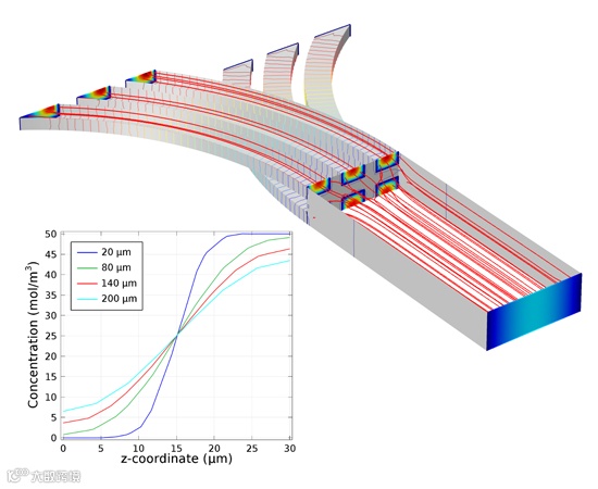 微流体模块提供一个用于仿真稀物质传递的专用物理接口。该接口假设混合物中的一种成分(溶剂)过量存在(90 mol% 或更高),可以仿真这种混合物通过扩散、对流(与流体流动耦合时)和电场迁移等方式进行的化学物质传递。它通常用于模拟混合器的性能。要模拟微流体器件中的化学反应,可以将微流体模块与化学反应工程模块组合,当然,这也可以使用浓物质传递接口进行组合。