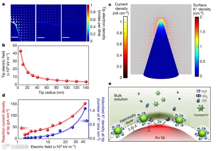 图 Computed electric field, K+ concentration and current density near the tip of an electrode as a function of tip radius.