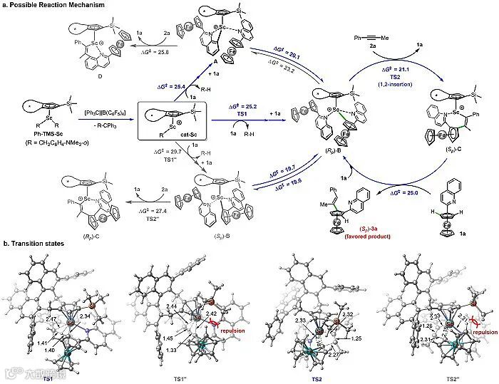 接下来,为研究该反应的机理以及立体和区域选择性的原因,作者进行了大量的DFT理论计算(图5)。计算结果表明,从钪阳离子活性物出发,反应可能会生成三种C‒H键活化的中间体A、(Rp)-B和(Sp)-C,且这些中间体之间能互相转化。其中,2-喹啉二茂铁1a的C8‒H键活化经由25.4 kcal/mol的能垒形成中间体A。而炔烃插入中间体A的能垒为25.8 kcal/mol,与之相比,中间体A通过分子内的C‒H键活化转变为二茂铁环C‒H键活化产物(Rp)-B (ΔG‡ = 20.1 kcal/mol)的路径更有利。因此,中间体A倾向于转化为(Rp)-B。另一方面,中间体(Rp)-B能够直接通过底物1a与催化作用生成(ΔG‡ = 25.2 kcal/mol)。随后,炔烃2a对(Rp)-B的插入能垒相对较低(21.1 kcal/mol),生成中间体(Sp)-C。中间体(Sp)-C通过活化另一分子1a的C‒H键可重新得到催化活性物种(Rp)-B并释放优势产物(Sp)-3a,完成催化循环。值得注意的是,催化剂活化二茂铁另一侧C‒H键形成环金属中间体(Sp)-B由于位阻排斥需要克服较高的反应能垒(29.7 kcal/mol)。虽然(Sp)-B可以通过中间体(Rp)-B的转化得到(19.6 kcal/mol),但(Sp)-B重新转化为中间体(Rp)-B的能垒(19.7 kcal/mol)远低于炔烃对(Sp)-B的插入(27.4 kcal/mol)。因此,炔烃插入过程选择性地通过(Rp)-B发生,从而获得(Sp)-3a产物。理论计算结果很好地解释了氘代标记实验现象,并通过结构分析揭示了该反应体系立体和区域选择性的内在原因。