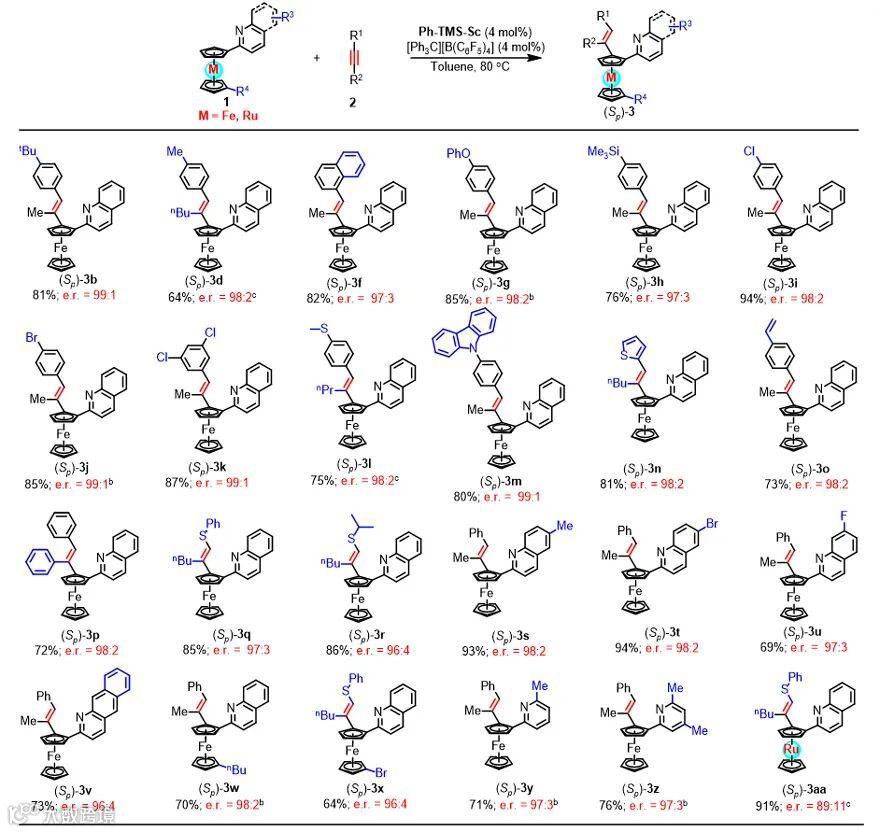 作者首先以2-喹啉二茂铁1a和苯丙炔2a作为原料,对不同的手性半夹心钪催化剂进行了筛选(图2)。其中, 3,3’-位甲氧基取代(OMe-Sc)以及硅醚取代(TIPS-Sc、TBDPS-Sc)的手性钪催化剂不能催化该反应进行。而当使用3,3’-位苯基取代的钪催化剂(Ph-Sc)时,作者以61%的收率以及95:5的立体选择性分离得到目标产物3a。通过在手性环戊二烯环上引入大位阻的TMS基团,作者成功合成了一例新颖的手性半夹心钪催化剂Ph-TMS-Sc。令人欣喜的是,该催化剂能以更高的收率和立体选择性(81%,98:2 e.r. )得到目标产物。