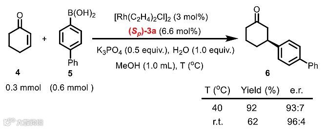 最后,利用(Sp)-3a作为N/烯烃配体,铑催化的芳基硼酸对环己烯酮的共轭加成反应可以在温和的条件下进行,并且获得较高的立体选择性(96:4 e.r. )。该结果说明通过本方法获得的面手性二茂铁衍生物在不对称催化中具有一定的应用前景(图6)。