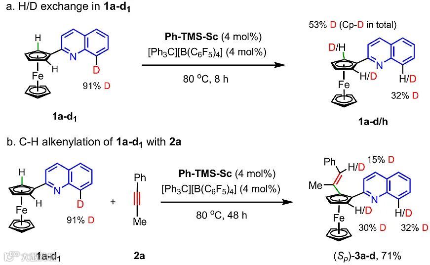 通过氘代标记实验,作者发现,在没有炔烃存在的条件下,C8-氘代的2-喹啉二茂铁1a-d1在催化体系中反应8小时后,二茂铁环上部分发生氘代反应,同时C8位则发生部分氢质子化。而通过分析1a-d1与炔烃的烯基化反应产物,作者发现烯基氢有部分氘代,且二茂铁的另一侧碳氢键也有部分氘代。以上氘代实验表明,尽管C8位和二茂铁单元的环戊二烯基环上两侧C‒H键在反应过程中均参与了活化,但烯基化反应只选择性地反应在二茂铁环的其中一侧(图4)。
