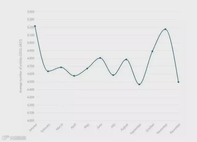 Nature Index 通过统计 68 种期刊 2012-2017 年的论文投稿情况:整个春天(从二月到五月),发文量普遍较低,属于发表论文的淡季;发文量在每年的十一月和次年的一月迎来峰值。根据统计结果,一年十二个月,每个月份的发文量是不一样的,2012-2017年每个月的发文量始终处于波动状态,尤其是下半年波动非常剧烈。(最近被拒稿的小伙伴不要急,并不是你的文章不够优秀,可能因为目前还是淡季...)