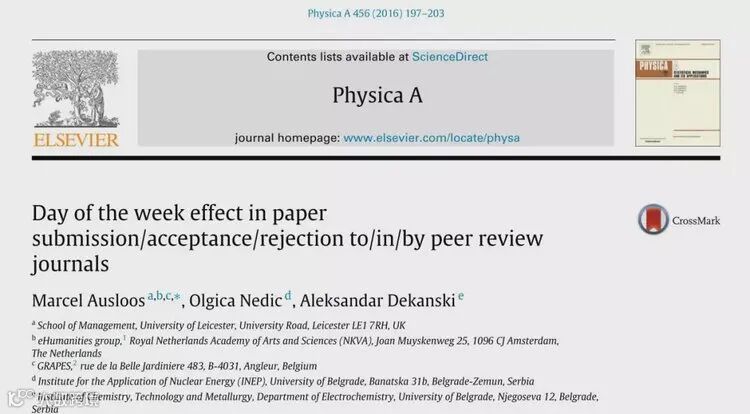 此外,Springer 旗下Scientometrics期刊上用更加细化、具体的分析证明周末真的不宜投稿。该文章利用计量经济学分析在 Physica A、PLOS ONE、Nature、Cell 四本 SCI 期刊上基于全球 178000 个投稿样本数据进行统计分析。通过复杂的模型和大量的运算得出:四份期刊中被接受发表的论文更有可能是在工作日提交,而不是在周末提交 。