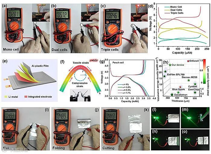 利用固态电池独特的堆叠特性,内部串联两个电池单元,制作的软包电池具有3.7 V高电压平台,其面容量和体积能量密度可与商用的薄膜电池或微电池相媲美;且表现出优异的柔性,在不同弯曲状态下电化学性能几乎没有下降,以及在滥用测试条件下表现出良好的安全性。