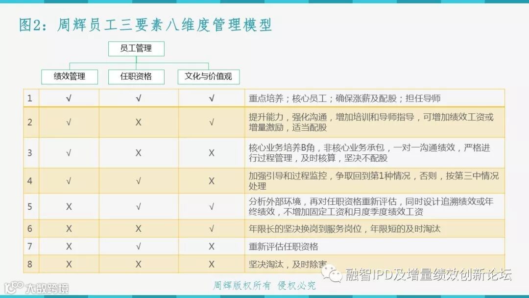 针对核心员工企业应该增加培训,提升能力,配置增量绩效岗位,并加强文化价值观的引导。企业对不同的对象采取不同的方法,灵活的使用增量绩效、任职资格、文化与价值观,针对不同的对象设计不同的管理选拔模式,才能不断地进步,提高投入产出比,减少管理成本,避免文化泛滥,实现“减人、增效、加薪”的管理模式。