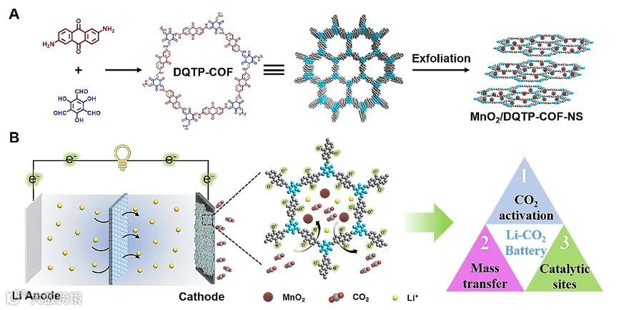 图1. (A) 化学法剥离DQTP-COF变为二氧化锰负载的纳米薄片的过程示意图; (B) MnO2/DQTP-COF-NS作为Li-CO2电池正极催化剂的优势