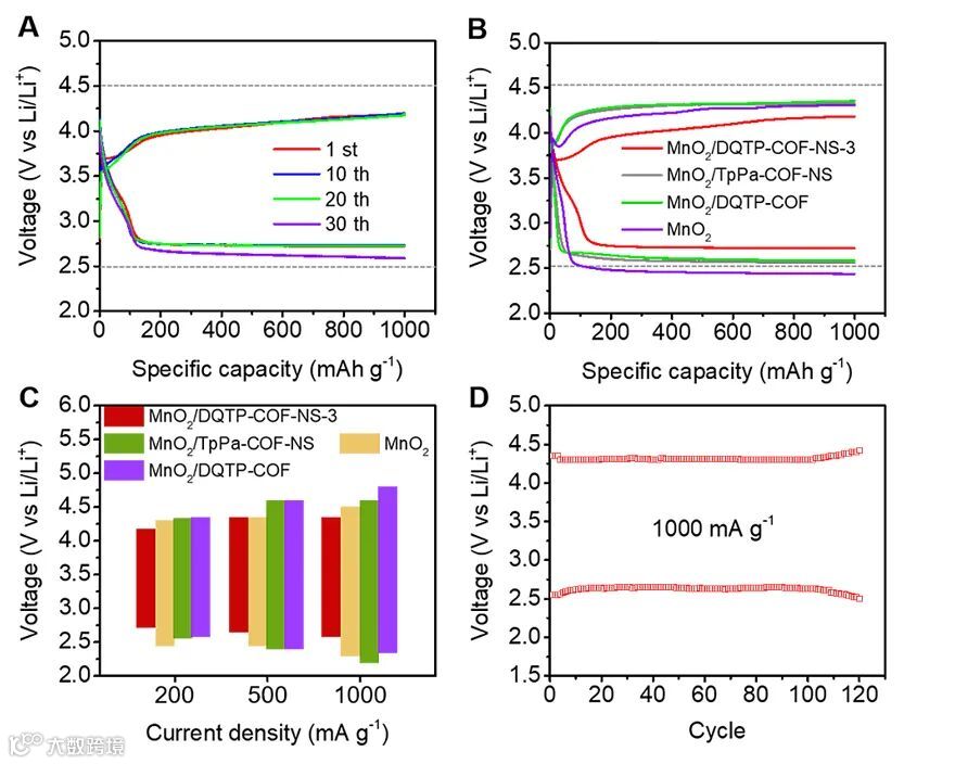 图3. MnO2/DQTP-COF-NS及对比样品的Li-CO2电池性能