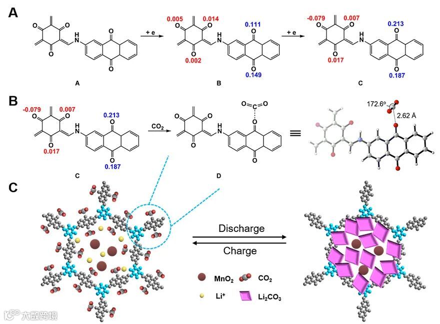 作者通过理论计算推断出这类正极催化剂在Li-CO2电池初始过程中的机理。DQTP-COF中的醌氧基团得到电子并转化为中间还原态。随后,醌氧基团与CO2形成一种稳定的quinone-CO2加成产物。经过计算,在该过程中二氧化碳活化需要的能量ΔG为9.5 kcal/mol,这低于CO2得到一个电子后活化的能量CO2 + e- → CO2·-(ΔG = 18.5 kcal/mol)。醌氧的存在确实对CO2的活化起着至关重要的作用,这对于提高Li-CO2电池的性能具有重要意义。