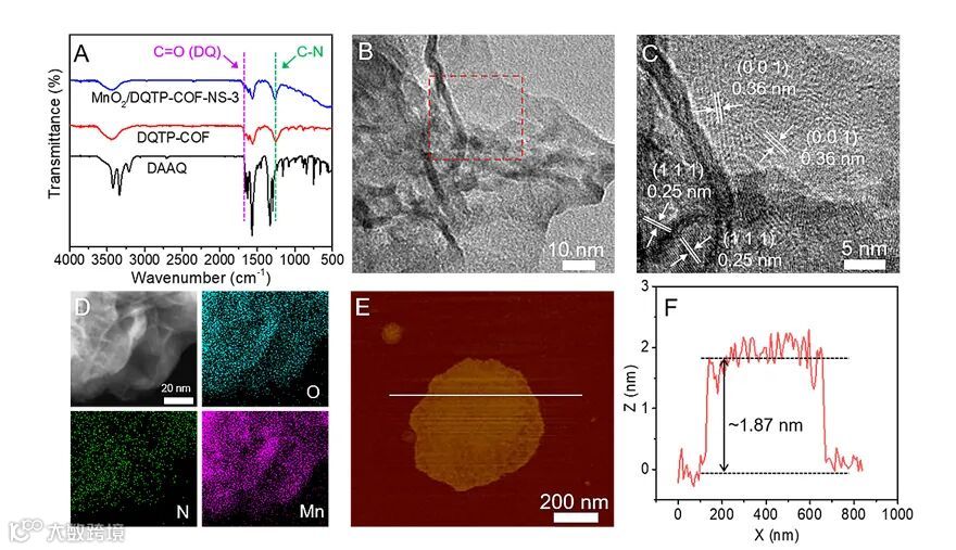 剥离后,块状DQTP-COF厚度大幅下降变为超薄纳米薄片。红外光谱显示了DQTP-COF的结构完整性。AFM检测到MnO2/DQTP-COF-NS厚度约为1.87 nm,大约6个分子层的厚度,远小于DQTP-COF。HR-TEM图像显示出MnO2和DQTP-COF的晶面。而且Mn、N、O三种元素在纳米片中分布均匀。以上表征证明了MnO2和DQTP-COF完美复合得到杂化材料。