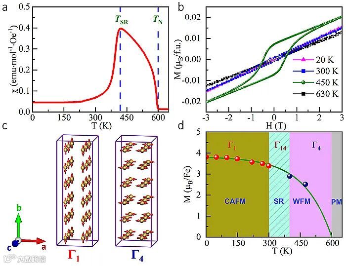 图3. PbFeO3磁化率、磁化强度、磁结构示意图及磁转变相图。
