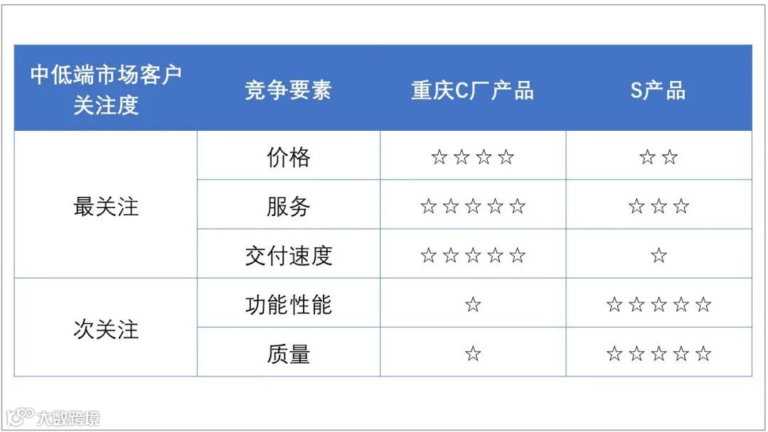 我们将问题进一步细化,在中低端市场上,与重庆C厂相比,我们的卖点在哪里?