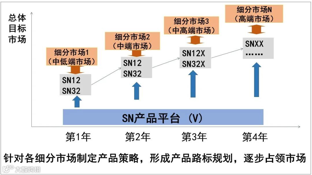 带着对以上三大问题的思考,整个产品团队和融智顾问展开了激烈的研讨,形成了最终策略概括为:建立技术货架,构建产品平台,在产品平台上,针对细分市场形成产品矩阵,实现“ 低端低价要规模,高端高价要利润”。