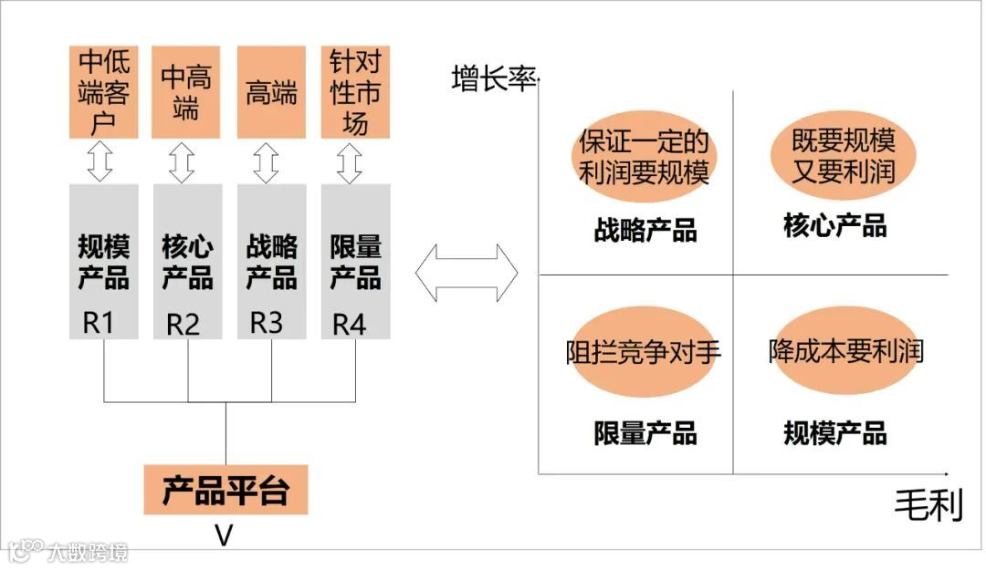 图:基于技术货架和产品平台(V),面向细分市场开发产品(R),形成产品矩阵