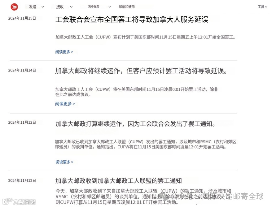 2024年11月12号收到加拿大邮政来自加拿大邮政工人联盟(CUPW)的罢工通知,涉及城市和RSMC(农村和郊区邮递员)的谈判单位。通知指出,除非双方在此之前达成协议,否则CUPW打算从11月15日星期五凌晨12:01 ET开始罢工活动。现在已经确定的是:加拿大邮政工人工会(CUPW)宣布美国东部时间11月15日凌晨12:01开始全国罢工。