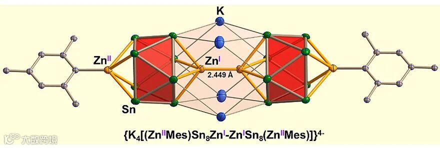 {[K2ZnSn8(ZnMes)]2}4-的团簇结构及Zn-Zn键展示