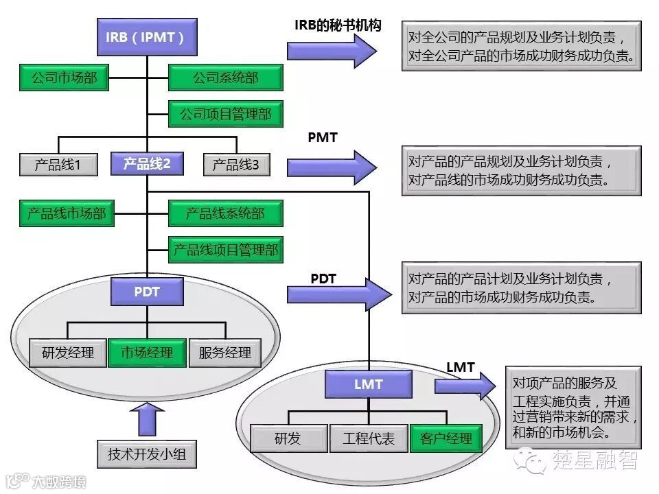 管理层:产品集成管理团队,简称IPMT,主要对产品的市场成功财务成功负责,同时管理项目的交付及产出,通常的表现形式为产品线管理部或产品经理管理部,其职位通常为产品线总经理或产品经理
