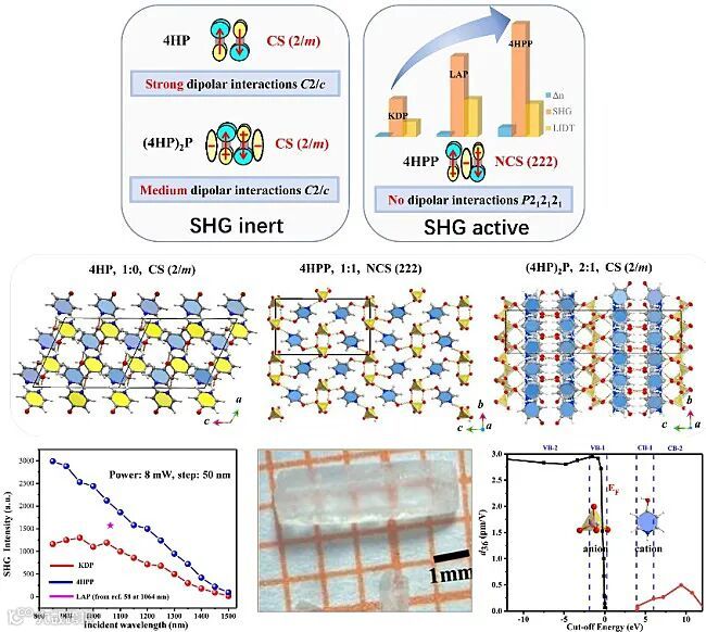 针对上述科学问题和技术需求,北京师范大学化学学院吴立明、陈玲教授课题组近期通过第一性原理计算筛选出具有大的极化各向异性、大超极化率和较大的带隙的极性有机发色团四羟基吡啶阳离子 (C5H6ON)+,首次提出其可作为优越的紫外日盲区NLO活性功能基元。基于此,他们利用“盐策略”,结合氢键工程,通过调节阴阳离子二元体系的混合摩尔比例 (C5H6ON)+ : (H2PO4)− = 1 : 0,2 : 1,1 : 1,有效地调控了晶体中有机基团偶极-偶极相互作用,回避了偶极相互作用诱导的“中心对称陷阱”,成功设计合成了一种性能优越的半有机紫外日盲区NLO晶体(C5H6ON)+(H2PO4)−,4HPP。研究表明,其在重要的可见至近红外光学基波范围 (600-1500 nm) 呈现出较大的二阶倍频响应 (2.1-3 × KDP), 优于目前商业化的半有机LAP和DLAP晶体 (2.14 × KDP),且其中有机阳离子基团(C5H6ON)+由于其具有π共轭的显著结构各向异性,使得4HPP晶体呈现出较大的双折射率 (0.25 @1064 nm),远大于具有非π共轭特点的LAP晶体 (0.075 @1064 nm)。此外,与LAP晶体相比较,4HPP还呈现出较宽的透过范围 (0.26–1.50 μm),较好的热稳定性 (166 °C vs 112 °C of LAP) 和高的激光损伤阈值LIDT (2.2 × KDP),是一种综合性能优越的、具有重要应用前景的NLO材料。