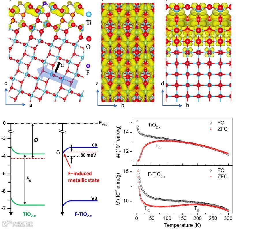 理论计算表明,表面氟化之后二氧化钛的费米能级向上移动进入导带,从而导致金属化的表面。从电荷密度分布图可以看出新出现的金属态归因于表面桥联的Ti-F-Ti键,由表面和亚表面Ti原子的3d轨道和表面F原子的2p轨道所组成。为了进一步阐释半导体表面金属化的特性,作者通过一系列实验手段进一步测量了半导体表面能带位置,最终结果表明导带低部位于费米能级下方约80 meV,与计算结果一致。同时,磁性研究显示金属化的表面会引起体相Ti3+自旋上的强烈磁阻挫,从而导致F-TiO2-x材料在50 K时从受阻的超顺磁态(SP)向量子超顺磁态(QSP)的转变。
