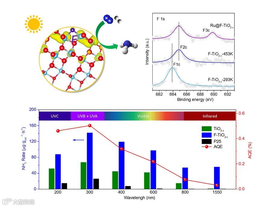 近日,吉林大学的李路教授和加拿大麦吉尔大学孔祥华博士领导的研究团队利用表面F-离子掺杂,实现了TiO2半导体材料的表面金属化,由于F-与相邻的Ti3+之间的强电子排斥力,使得F-TiO2-x具有较低功函和良好的给电子能力。在其表面引入金属Ru纳米活性位点,由于金属-半导体界面间存在欧姆接触,能够有效的将光生电子从催化剂本体传递到Ru活性位点,实现对于氮气分子的高效活化。此外,金属化的表面和大量体相Ti3+能够有效吸收红外光波段的光子,使得该材料在整个可见光和近红外光(400-1550 nm)范围内均表现出良好的光催化合成氨活性。