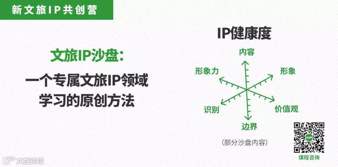 “文旅IP沙盘将从IP价值观定位、所处阶段、势能分析的角度出发,结合课程所涉及知识点,通过品牌健康度以及IP健康度,双指标的自我检测,来了解一个IP目前所处阶段,或将做的IP漏洞所在,最后通过思维逻辑表,理清IP脉络。”