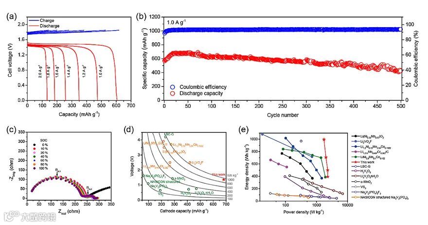 图4. 电化学性能。(a)双离子电池不同倍率下的恒流充放电曲线。(b)双离子电池的循环稳定性。(c)不同SOC下石墨烯正极在WSOE45-1中的Nyquist曲线。(d)溴插层石墨烯正极与其它水系、非水系正极材料的容量-电压对比图。(e)溴插层石墨烯正极与其它水系、非水系正极材料的能量-功率对比图。