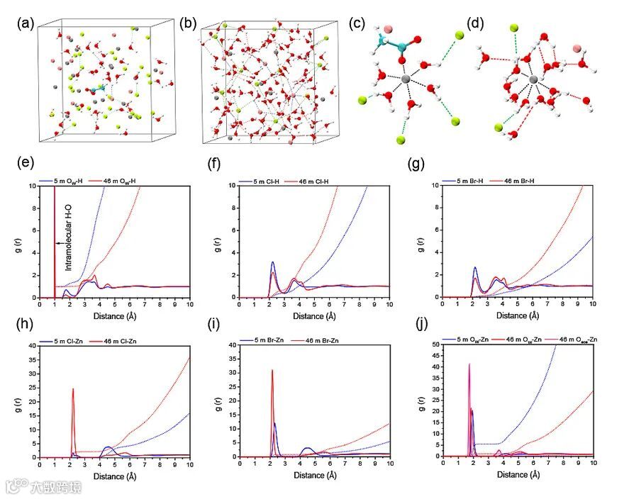 图2. 分子动力学模拟。(a)WSOE45-1和(b)5 m ZnBr0.5Cl1.5的MD模拟截图。原子颜色:锌,灰色;氧,红色;氢,白色;碳,蓝色;氯,绿色;溴,紫色;相互作用:O∙∙∙H,红线;Cl-∙∙∙H,绿线;Br-∙∙∙H蓝线;O∙∙∙Zn2+,灰线。(c)从a中提取的典型分子构象。(d)从b中提取的典型分子构象。(e-g)WSOE45-1和5 m ZnBr0.5Cl1.5电解质中H原子的径向分布和积分曲线,(h-j)WSOE45-1和5 m ZnBr0.5Cl1.5电解质中Zn原子的径向分布和积分曲线。OW代表水分子中的氧原子,Oace代表醋酸根阴离子中的氧原子。