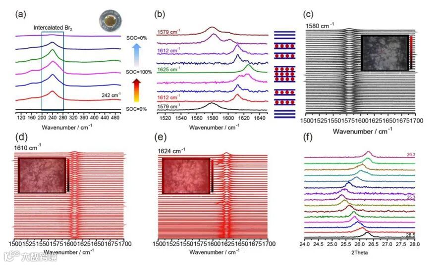 图5. 电池机理表征。(a和b)充放电过程中石墨烯正极的原位拉曼光谱图。(c)充电前石墨烯正极的原位拉曼mapping图,(d)充电过程中2阶Br插层的石墨烯正极原位拉曼mapping图,(e)充电过程中1阶Br插层的石墨烯正极原位拉满mapping图。(f)充放电过程中石墨烯正极的原位X-射线衍射光谱图。