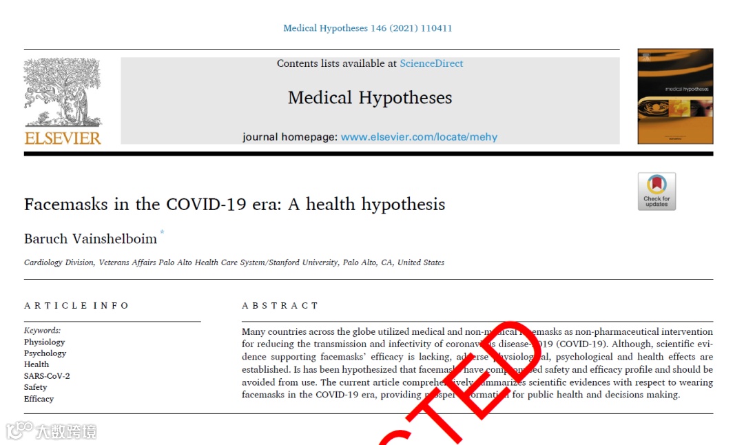 最近,一篇“熟鸡蛋返生”的玄幻论文在网络上引起围观。作者不仅坚持认为自己“不走寻常路”的研究结果靠谱,还“碰瓷”郑州大学和中科院,引得两所学术机构纷纷与之撇清关系。无独有偶,在大洋彼岸的美国,也发生了一场类似的学术闹剧。一位自称是斯坦福大学教授的神秘学者Baruch Vainshelboim,在Elsevier旗下期刊《医学假说》(Medical Hypotheses)上发表文章,声称有足够的证据表明戴口罩不能阻止COVID-19病毒传播,与之相反会带来一系列对身心有害的副作用。文章的内容引起了巨大的争议,仅仅两个月后就被期刊撤稿(图1 )。