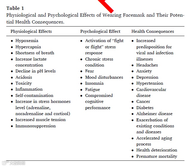 文章列表阐述配戴口罩对人的生理、心理和健康三方面潜在不良影响。表中所有数据都未经验证,且存在若干主观推测型语句。
