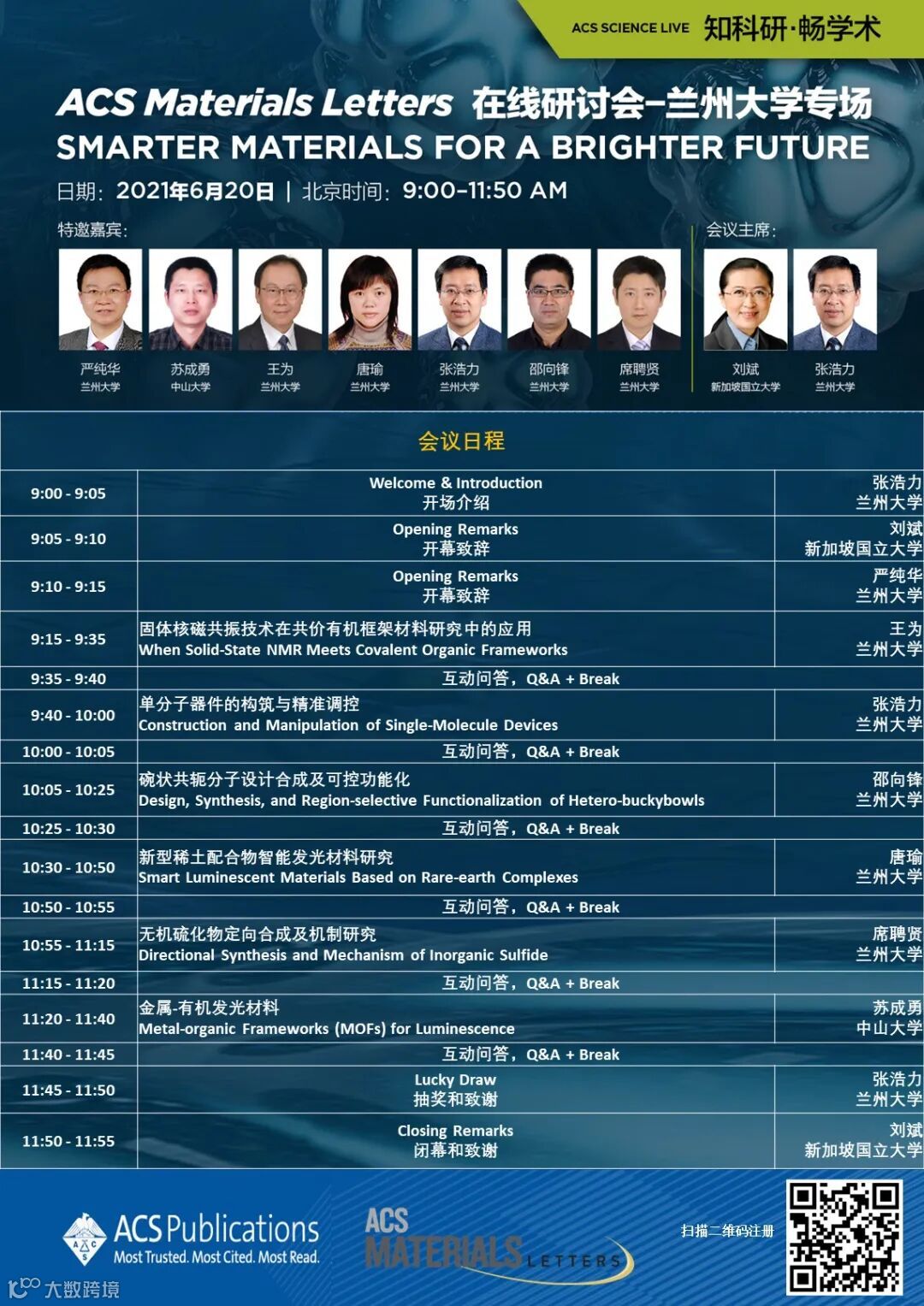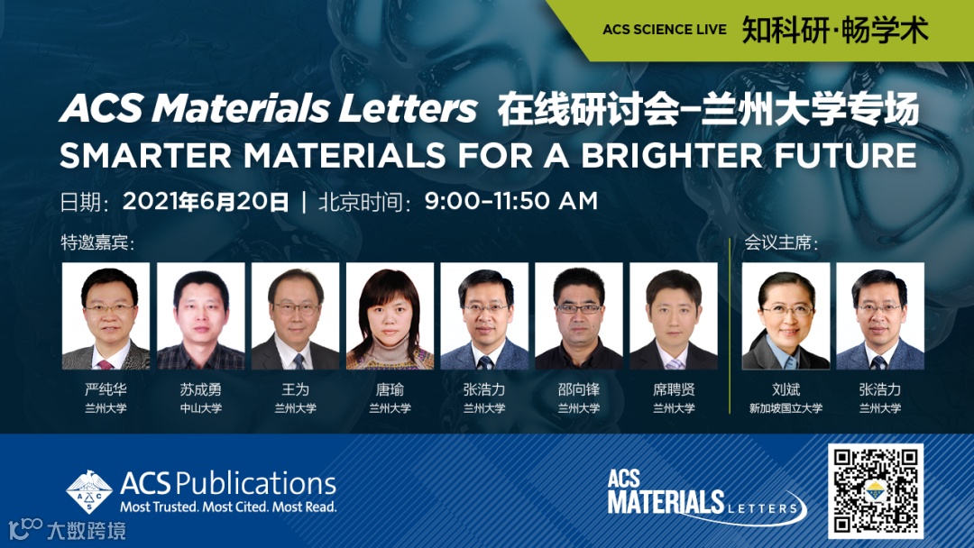 为诚挚感谢期刊的作者、读者和审稿人并与其进行深入交流,执行主编刘斌教授携其编辑团队开启了2021年走进中国高校和研究所的系列研讨会活动。在相继成功举办了“ACS Materials Letters 在线研讨会-吉林大学专场”和“ACS Materials Letters 在线研讨会-苏州大学专场”后,第三站研讨会将与兰州大学共同举办,聚焦“Smarter Materials for A Brighter Future”。