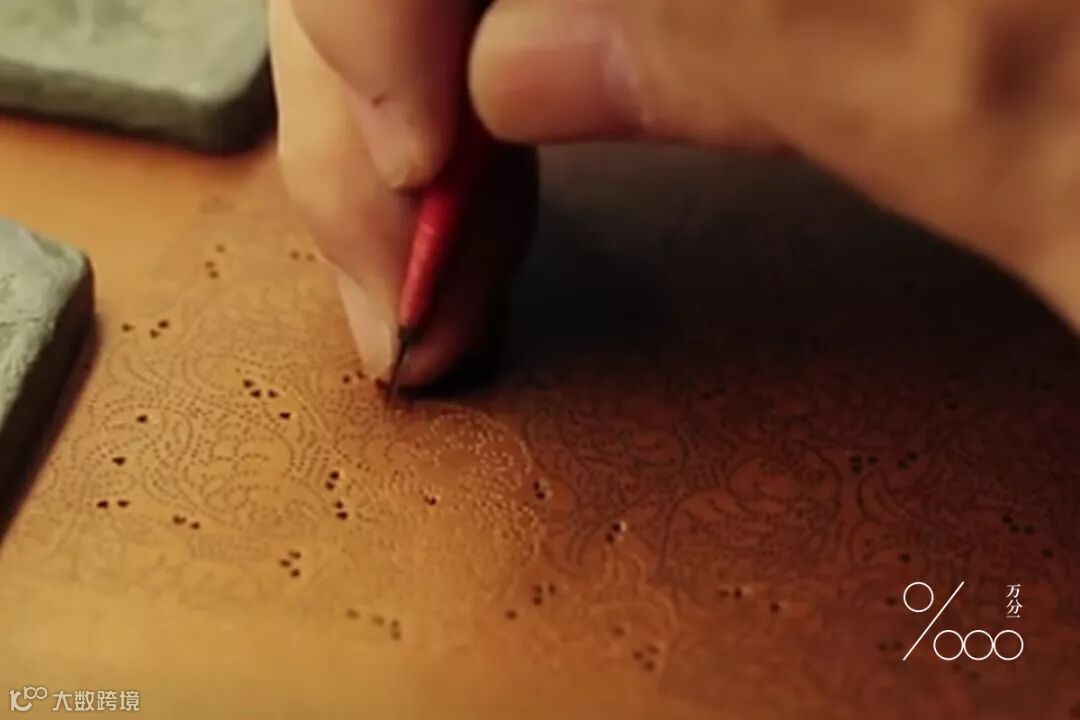 在众多工序中,样纸的设计制作最为繁琐复杂。工匠在薄纸上使用锥子及类似凿子的纯手工制作的工具进行锥刻、刺刻。纸上不只有内敛高贵的细腻纹样,而且纸的最左边和最右边的纹路是可以无缝拼接起来的。这是为了在长长的「反物」上保证纹样的连贯性
