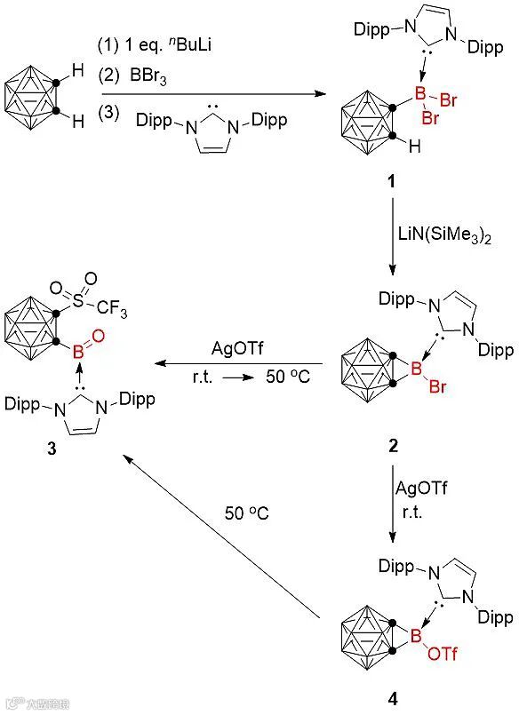 作者采用简单的盐消除反应合成了碳硼烷杂三元环硼溴化合物2。通过三元环硼溴化合物2与三氟甲磺酸银的反应,作者意外地分离得到了首例无酸稳定的中性硼氧双键化合物3。在室温条件下,三元环硼溴化合物2与三氟甲磺酸银发生取代反应,生成三氟甲磺酸基取代的三元环含硼关键中间体4。在50 ℃条件下,该中间体4可以有效转化为硼氧双键化合物3(图1)。