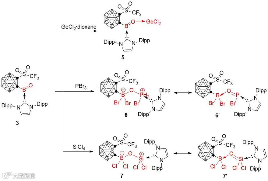 另一方面,作者对硼氧化合物3的反应性质进行了研究。结果发现该化合物可以和二氯化锗发生配位反应得到路易斯酸稳定的硼氧双键化合物5,和三溴化磷或者四氯化硅反应得到硼氧双键的1,2-加成产物。其中化合物6可以看做路易斯酸(o-carboranyl-BBr2)和路易斯碱(卡宾)稳定的磷氧双键化合物(Br-P=O)。化合物7可以也看做路易斯酸(o-carboranyl-BBr2)和路易斯碱(卡宾)稳定的硅氧双键化合物(Cl2-Si=O)(图3)。